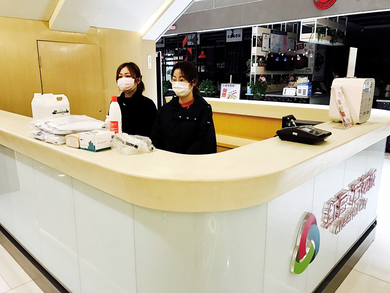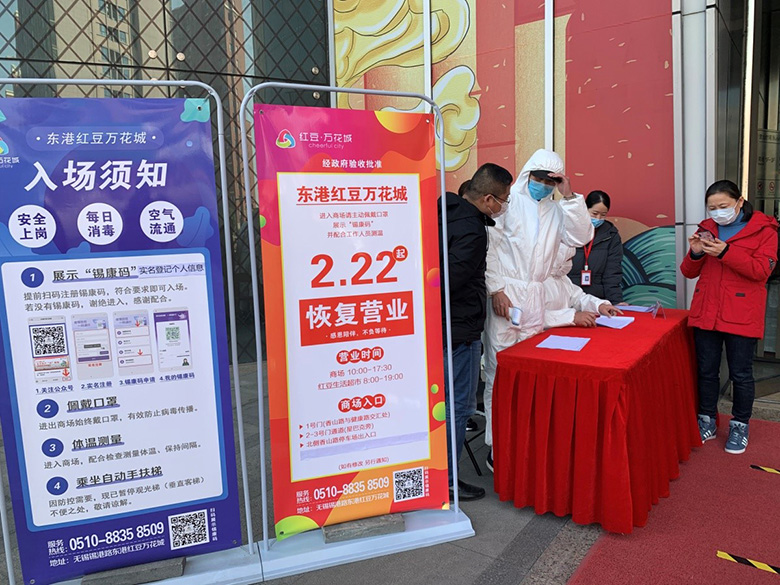 位于無錫的東港紅豆萬花城內燈火輝煌,遍布4層樓的大小店鋪相繼開門營業?!?月末,無錫中山路紅豆萬花城、東港紅豆萬花城恢復營業,我們按照政府相關規定要求進入商城的顧客必須佩戴口罩,配合測溫、展示‘錫康碼’。本月,我們分布在無錫及鎮江的各紅豆萬花城商業綜合體都相繼恢復了營業。”2月27日上午,東港紅豆萬花城入口處,工作人員給兩位客人邊量體溫邊說,只見一邊,消毒用品、洗手液、紙巾等一應齊全。