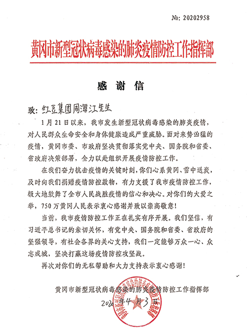 近日,湖北省“黃岡市疫情防控工作指揮部”給紅豆集團黨委書記、董事局主席兼CEO周海江發來感謝信,信中說,“在我們奮力抗擊疫情的關鍵時刻,你們心系黃岡、雪中送炭,及時向我們捐贈疫情防控款物,有力支援了我市疫情防控工作,極大地鼓舞了全市人民戰勝疫情的信心和決心。對你們的大愛之舉,750萬黃岡人民表示衷心感謝并致以崇高敬意!”