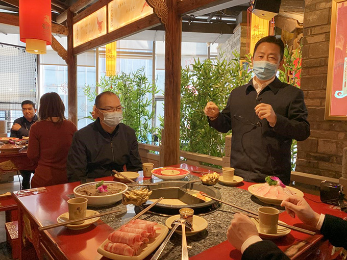 為餐飲行業(yè)打CALL!3月15日星期天中午,紅豆集團(tuán)董事局主席兼CEO周海江帶領(lǐng)集團(tuán)黨員干部來(lái)到剛剛恢復(fù)營(yíng)業(yè)的無(wú)錫東港紅豆萬(wàn)花城蜀大俠火鍋店,通過(guò)測(cè)溫、掃錫康碼包括手部消毒后進(jìn)入店堂點(diǎn)餐消費(fèi),以實(shí)際消費(fèi)行動(dòng)支持中小企業(yè)的復(fù)蘇。